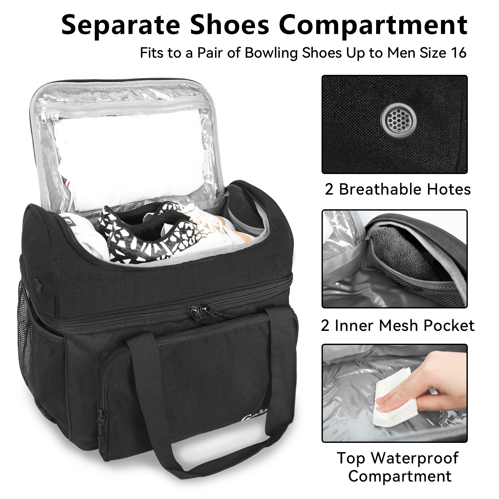 - 【Carry All Gear In One Bag】2 ball bowling bag is large enough to carry all your bowling accessories, consisting of a main compartment for 2 bowling balls, 1 front pocket, 1 back pocket, 2 side pockets and a dedicated shoes compartment(with ventilation vents) for a pair of shoes (up to men's size 16) and other gear. The front bag of the bowling bag is made of insulation material, which is enough to hold 5 cans of drinks. You can share cold drinks with friends who are resting.